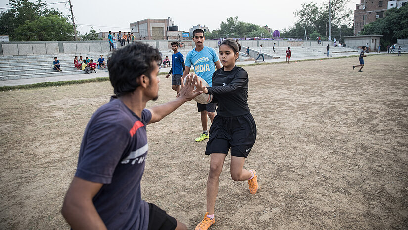 Mädchen und Jungen spielen beim „Touch Rugby“ in Delhi in gemischten Mannschaften. Der gemeinsame Sport stärkt das Selbstbewusstsein der Mädchen und beseitigt Stereotype.