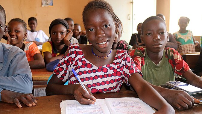 Wir sorgen in unseren Programmgebieten für den Bau von Schulen mit kindgerechter Ausstattung und tragen dazu bei, dass Schulbücher und weitere Materialien für den Unterricht bereitstehen. Auch organisieren wir auf dem Schulgelände den Bau von nach Geschlechtern getrennten Sanitäranlagen und bilden Leher:innen in kindgerechten Unterrichtsmethoden weiter.
