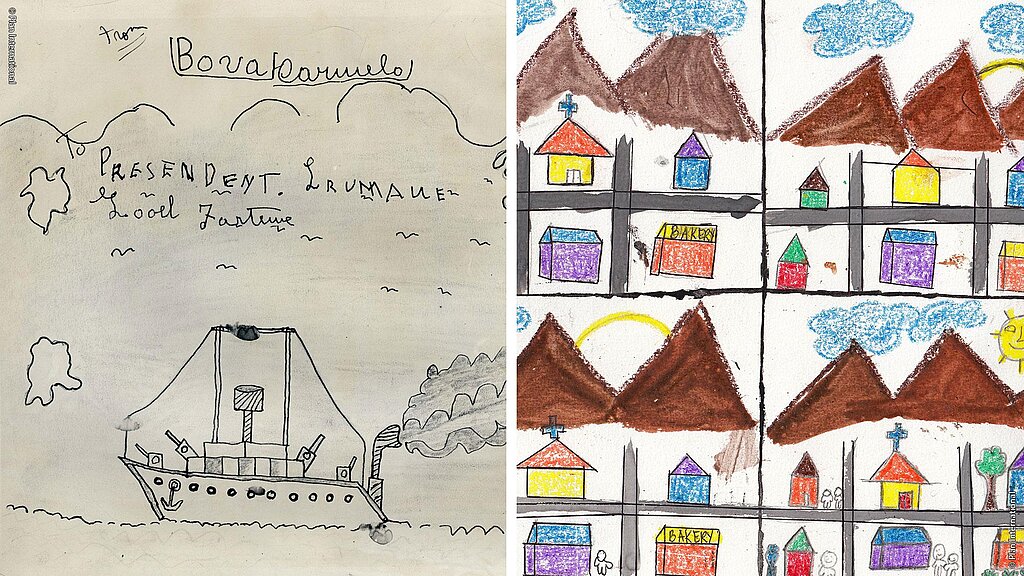 Bilder helfen am besten, Erlebtes zu verarbeiten. Und sie sind ein guter Weg, um Menschen für ihre Unterstützung zu danken. Links hat der kriegsverwundete Carmelo vor seiner Operation ein Dankeschön für Präsident Truman gemalt. Carmelo hat das Bild gezeichnet, indem er den Stift mit den Zähnen gehalten hat.