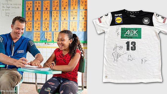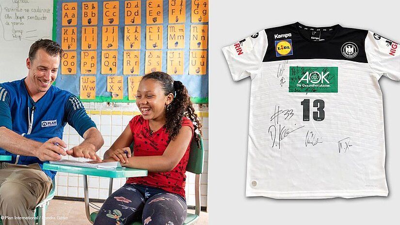 Es ist eines der Highlights der Handballsaison: Am 26. Oktober wurde dieses Jahr wieder der TAG DES HANDBALLS in Hannover gefeiert. Neben den Spielen der Nationalmannschaften der Frauen und Männer fand ein buntes Rahmenprogramm für Fans und Familien statt. Auch Plan International war mit vor Ort, denn der Deutsche Handballbund unterstützt das Plan-Projekt „Sport schafft sichere Schulen in Hanoi“ und setzt sich so für den Schutz von Kindern in Vietnam ein. Mit dem ARD-Experten und Weltmeister von 2007 Dominik Klein war ein weiterer prominenter ehemaliger Handballspieler vertreten, der als Plan-Botschafter im Sommer verschiedene Plan-Projekt in Brasilien besucht hat. Sie haben nun die einmalige Chance, sich eine tolle Erinnerung vom TAG DES HANDBALLS zu sichern. Bieten Sie mit auf ein exklusives Trikot der Nationalmannschaft, signiert von den Spielern und Dominik Klein. Alle Erlöse fließen direkt an das Projekt „Sport schafft sichere Schulen in Hanoi“ von Plan International.