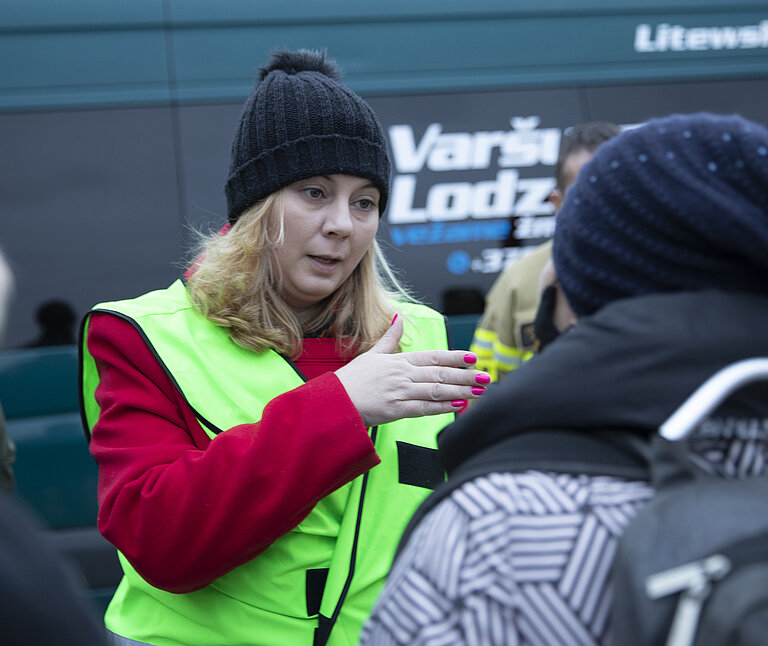 Zusammen mit Kolleg:innen aus der nahegelegenen Stadt Lublin richtete sie Stationen ein, um dort die geflüchteten Menschen, die in der Region ankommen, aufzunehmen. Monika ist für zwei Aufnahmestellen zuständig: Eine an der Sporthalle, zu der Menschen, die zu Fuß über die Grenze gekommen sind, mit dem Bus gebracht werden, und eine am Hauptbahnhof für diejenigen, die mit dem Zug ankommen.