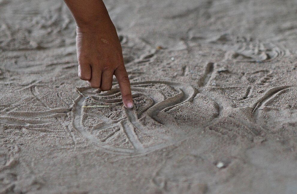Layhouys (23) Bild „Sanduhr“ stellt Kinderheirat als einen Prozess dar, in dem Zeit nicht neutral vergeht. In der Sanduhr fallen Bücher, ein Rucksack und Spielzeug nach unten, ersetzt durch Ketten, Armut und die Last früher Schwangerschaft. Außerhalb der Sanduhr formt ein Mädchen aus einer Kette einen Vogel, ein Symbol für das Entkommen und die Möglichkeit von Freiheit.
