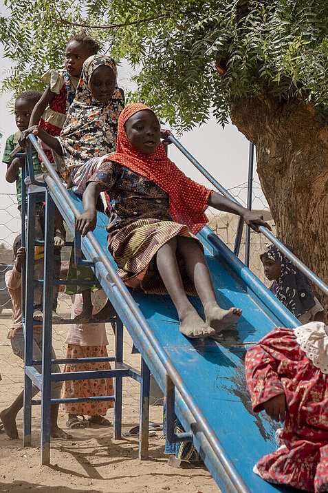 Aissata (12) hat im kinderfreundlichen Zentrum Spaß mit ihren Freund:innen