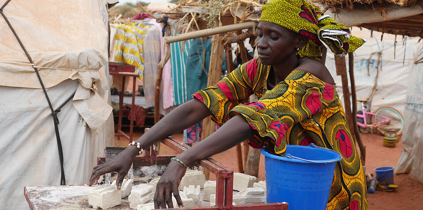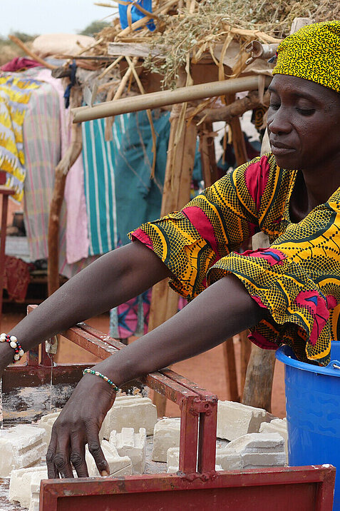 Seife und Waschmittel werden im Camp von jedem Haushalt im täglichen Leben verwendet, daher ist die Nachfrage groß und Hamssetou hat einen festen Kundenstamm: „Ich verkaufe die Seife jeden Tag, ich laufe durch das Camp und verkaufe sie an die Frauen, die ich kenne. Mit dem Gewinn aus dem Seifenhandel sorge ich dafür, dass meine Kinder essen und zur Schule gehen können.“ In dem Camp hat sich mittlerweile eine Kooperative von Seifenverkäufer:innen gebildet, deren Mitgliedsbeitrag Hamssetou wöchentlich bezahlt.
