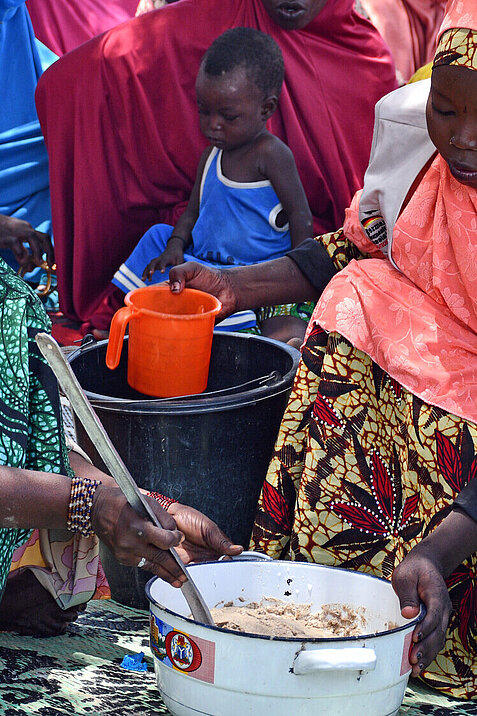 Die Kochdemonstrationen der Mamans Lumière sind ein zentraler Bestandteil eines Projekts von Plan International, das die Ernährungssituation in der krisengeprägten Tschadsee-Region verbessern soll. Sie besuchen Gemeinden in der Region Diffa in Niger und zeigen Frauen, wie sie nahrhafte, vitaminreiche Mahlzeiten zubereiten können. Heute steht ein angereicherter Porridge auf dem Programm – eine Mischung aus lokal verfügbaren Zutaten wie Erdnüssen, Hirse, Bohnen, Soja und Milch.
