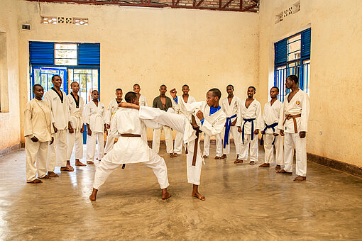 Im Raum herrscht höchste Konzentration. Wo so viele Jugendliche aufeinandertreffen, wird normalerweise gealbert, getuschelt, gelacht, aber die Sportart, die hier geübt wird, lebt von strenger Disziplin: Karate. Die Schüler:innen tragen ihre weißen Traingsanzüge mit Stolz. Nackte Füße bewegen sich bedacht über den glatt polierten Steinboden, üben die Abfolgen von Abwehrhaltung, Tritten, Schlägen und weiterer Positionen. Das Dojo, der Trainingsraum für die ostasiatische Kampfkunst, liegt in einer Siedlung im ostafrikanischen Ruanda, hauptsächlich geflüchtete Menschen aus dem benachbarten Kongo leben hier.