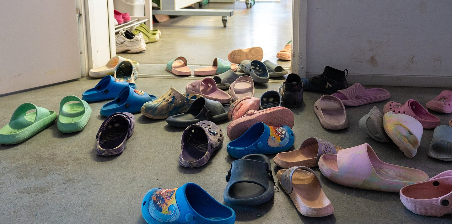 Nur noch zu einem Bruchteil ist die Unterkunft heute belegt. Waren in der Erstaufnahmeeinrichtung in Suhl zu Hochzeiten über 1.500 geflüchtete Menschen untergebracht, sind es jetzt nur noch knapp 200. Die gesamte Unterkunft ist gesichert durch einen hohen Metallzaun, bewacht durch Security-Personal. Es ist ein heißer Sommertag und das Gelände wie leergefegt, der Spielplatz verlassen. Ein paar Männer sitzen im Schatten der wenigen Bäume und drehen Zigaretten. Über einen leeren Platz geht’s zum Verwaltungshaus ins Untergeschoss. Am Ende eines langen Flures schließlich Kinderstimmen. Willkommen im „My Safe Space“ – der „sichere Raum“ ist ein heller und freundlicher Ort. Rund 15 Mädchen und Jungen sind schon da, ein Vater und mehrere Mütter, darunter auch eine junge Frau, die ihren Säugling stillt. Das Kinderprogramm hat gerade begonnen.