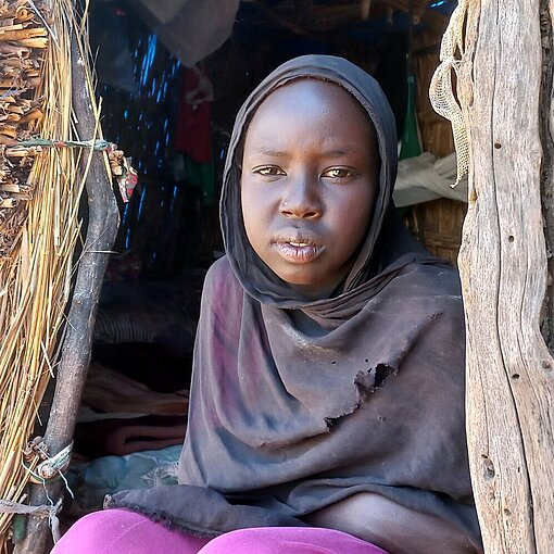 Zusammen mit ihren Eltern und ihren sieben Geschwistern musste Monira wegen des Krieges ihre Heimat verlassen, da es für sie dort nicht mehr sicher war. „Unser Leben in Sudan war sehr gut. Wir haben in einem großen und schönen Haus gewohnt, ich bin regelmäßig zur Schule gegangen“, erzählt die 12-Jährige. Jetzt lebt die Familie in einer kleinen Hütte mit Vorhängen als Türen und einem Dach aus Planen im Durchgangslager in Adré. „Wir haben keine Betten und müssen auf dem Boden schlafen. Zur Schule können wir auch nicht“, fährt sie fort.