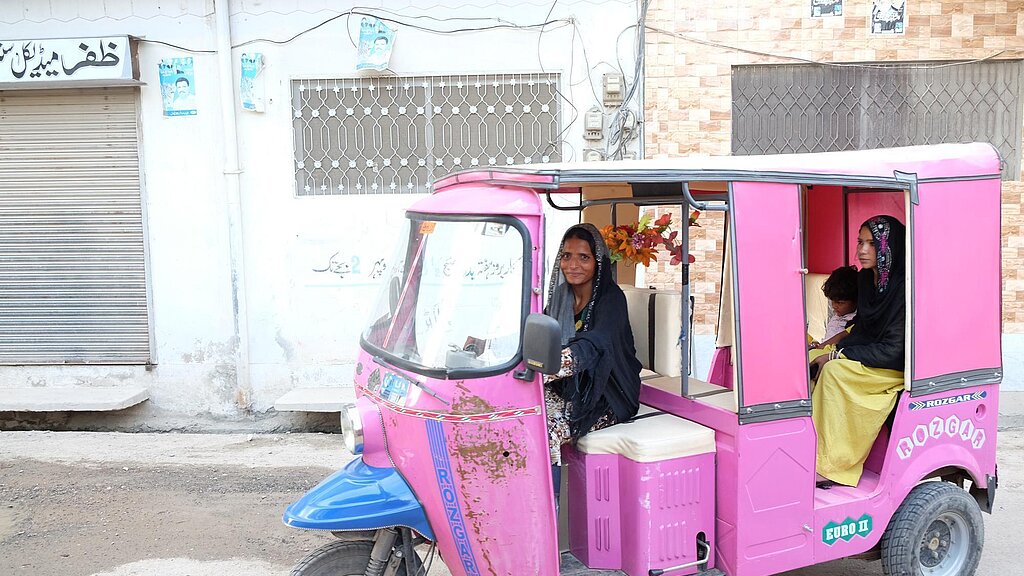 Die ausschließlich weiblichen Fahrerinnen der pinken Taxis stärken das Selbstbewusstsein aller Frauen in Pakistan und sind Vorbilder für die Frauen und Mädchen ihrer Gemeinden. Sie arbeiten in einem bis dahin ausschließlich von Männern dominierten Bereich und <link https: www.plan.de kampagnen-und-aktionen because-i-am-a-girl-fuer-die-rechte-von-maedchen aktuelles detail artikel die-schneiderin-von-dakar.html external-link-new-window>verdienen sich ihren Lebensunterhalt selbst. Neben Bildung ist die Möglichkeit, ein eigenes Einkommen zu erwirtschaften, einer der wichtigsten Faktoren für Frauen, um ihre Rechte wahrzunehmen und ein selbstbestimmtes Leben zu führen. Die Fahrerin Bali Rani erklärt ihre Motivation so: „Ich habe zwei Kinder und war dazu gezwungen, auf der Straße betteln zu gehen. Das Projekt von Plan International hat mir einen anständigen und respektvollen Weg gezeigt, Geld zu verdienen. Ich wurde Fahrerin einer pinken Rikscha. Nun kann ich meine Familie unterstützen und meinen Kindern eine gute Ausbildung bieten.“ Die Fahrerinnen fahren etwa 10 bis 12 Frauen und verdienen um die 300 Rupien pro Tag, was ungefähr 3 US-Dollar entspricht. Auch wenn dies noch ein geringes Einkommen darstellt: Sowohl für die Fahrerinnen als auch für die Fahrgäste bietet der Rikscha-Service ein neues Maß an Bewegungsfreiheit und Unabhängigkeit von ihren Familien.