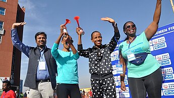 Der Länderdirektor von Plan International Äthiopien, Manoj Kumar, die Top-Athletinnen Meseret Defar und Meselech Melkmu sowie Äthiopiens UN-Abgeordnete Letty Chiwara sorgten für den sportlichen Auftakt an der Startlinie.