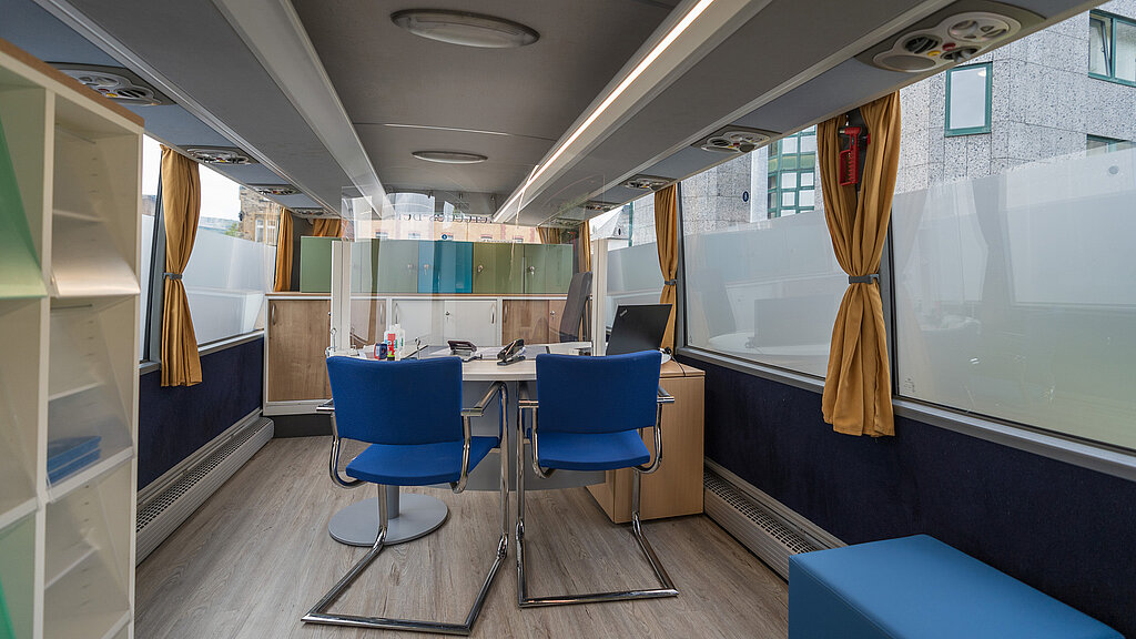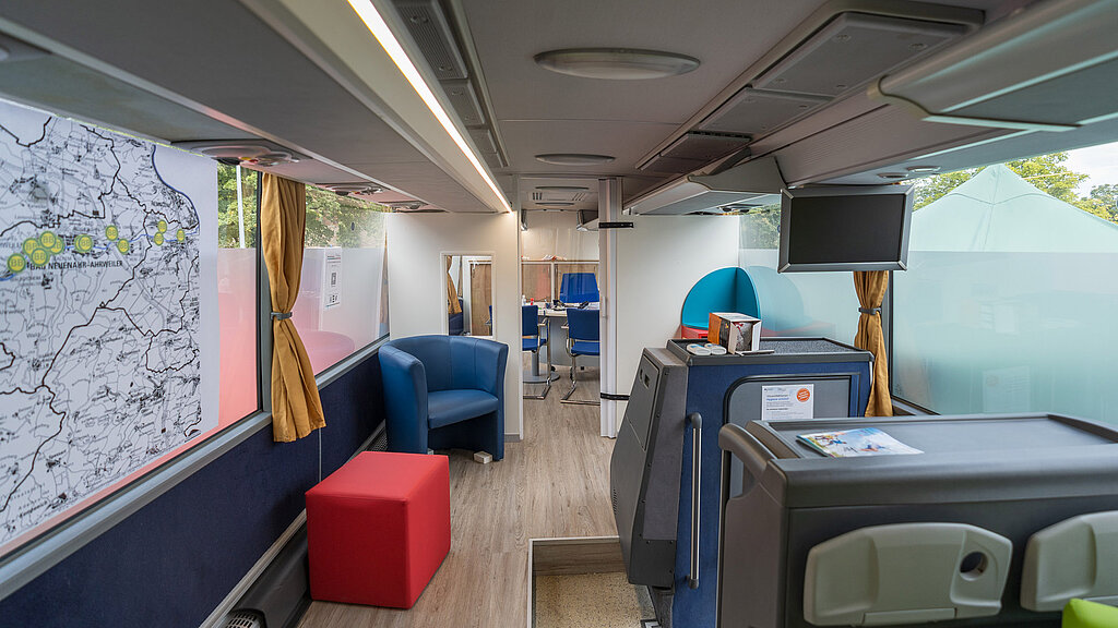 Der Bus verfügt über zwei Büros und eine Spielecke für Kinder. Betroffene werden bei Themen und Fragen des sozialen Alltags kostenlos und vertraulich vor Ort begleitet. An jeweils markanten Standorten bieten Fachkräfte aus dem psychosozialen Bereich sowie Verwaltungsmitarbeitende des Kreises Ahrweiler Informationen und Beratung zu allen Fragen des täglichen Lebens in der Phase des (Wieder-)Aufbaus nach der Flutkatastrophe. Zielgerichtet werden Standorte in den betroffenen Kommunen und Stadtteilen (25 Ortschaften) angefahren, mit denen insbesondere Kinder, Jugendliche und Familien vertraut sind - beispielweise Kitas und Schulen - sofern diese nicht zerstört sind.