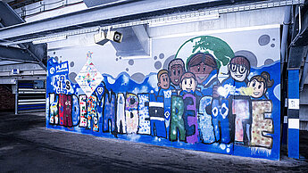 Neben einem inhaltlichen Workshop zu der Thematik ging es für die Teilnehmer:innen an den Stift und die Sprühdose, um ihre Rechte auch künstlerisch und kreativ sichtbar zu machen. Schnell wurde klar, dass Kunst und Fußball Sprachbarrieren durchbrechen und Menschen zusammenbringen können. Mit viel Farbe, Energie und einer unglaublichen Dynamik wurde das Werk schließlich finalisiert. Das Ergebnis ist ein lautstarkes Statement der Jüngsten, das nun sichtbar im Stadion die Fans, Besucher und den Verein selbst daran erinnert, den Kinderschutz aktiv zu leben und sich für die Rechte von Kindern einzusetzen.