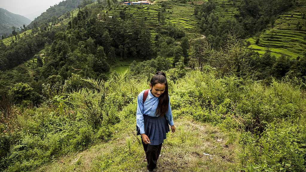 Um wieder am Schulunterricht teilzunehmen, nimmt Maju einige Strapazen in Kauf. 45 Minuten Fußmarsch liegen zwischen ihr und der provisorischen Schuleinrichtung. Auf ihrem Weg muss sie Berge, Täler und Flüsse passieren: „Es gibt eine Brücke, die wir sehr langsam überqueren müssen, da wir fürchten, dass sie zusammenbricht. Viele der Straßen sind auch rutschig“, erklärt sie.