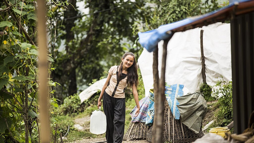 Durch das Erdbeben verlor die 13-Jährige Manju aus Dolakha nicht nur ihre eigenen vier Wände, sondern auch ihre Schule. Dolakha zählt zu einem der Bezirke, der heute noch stark von den Nachwirkungen des Bebens betroffen ist. Mehr als 50.000 Häuser wurden zerstört, 85 Prozent der Bevölkerung verloren ihr Zuhause. Wie viele andere Familien lebt Maju nun mit ihren Eltern in einer provisorischen Unterkunft.