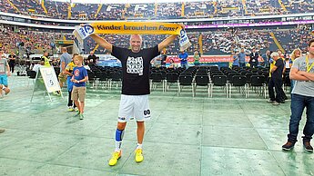 An diesem Tag im Zeichen des Handballsports wurde für jeden etwas geboten und dabei die Unterstützung für benachteiligte Kinder und ihre Familien nicht vergessen. Mit Frank Buschmann, Sport-Kommentator und Kapitän des Teams Buschi, hat Plan einen weiteren Unterstützer im Sport dazugewonnen, der sich für die Initiative „Kinder brauchen Fans!“ des Kinderhilfswerks auf eine neue Weise engagiert. Im Prominentenmatch gegen die Mannschaft von Ex-Nationalspieler Stefan Kretzschmar durfte Plan mit seinem Logo auf den Trikots des hochkarätig besetzten Teams Buschi vertreten sein. „Kinder und Jugendliche zu fördern, ist mir als Familienvater natürlich sehr wichtig. Plan tut dies in Entwicklungsländern, wo nachhaltige Hilfe dringend benötigt wird. Mit dieser Aktion möchte ich Plan unterstützen, seine tolle Arbeit bei einem großen Publikum noch bekannter zu machen“ so Frank Buschmann.