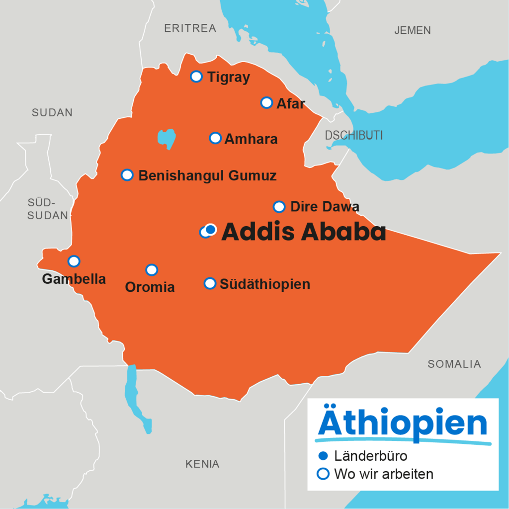 Äthiopien ist ein Binnenland am Horn von Afrika mit einer zerklüfteten Landschaft, die vom Großen Afrikanischen Grabenbruch durchzogen wird. Mit archäologischen Funden, die mehr als drei Millionen Jahre alt sind, ist es ein Land mit einer sehr alten Kultur. Zu den bedeutenden Stätten gehört Lalibela mit seinen in den Fels gehauenen christlichen Kirchen aus dem 12. bis 13. Jahrhundert. Plan International arbeitet seit 1995 in Äthiopien, insbesondere für und mit Mädchen und jungen Frauen. Wir sorgen dafür, dass sie besser vor Gewalt geschützt sind und gleichberechtigten Zugang zu Bildung und Ausbildung erhalten. Helfen Sie mit Ihrer Spende, die Lebenssituation für die Kinder und Familien vor Ort zu verbessern.