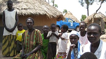 Als ich am Besuchstag pünktlich um neun Uhr im Plan-Büro erscheine, ist Philippe nicht da. Nach einem Mopedunfall liegt er im Krankenhaus. So begleiten mich Christine und Norah Aliyinza, Sponsorship Secretary aus Kampala, mit einem Fahrer zu Asinge C, Vincents Dorf. Zwischen den reetgedeckten Rundhütten erwarteten uns ein Dutzend Leute. Als erstes erkenne ich Pulkeria, Vincents Mutter. Sie sieht genauso aus wie auf den Fotos. Nur bemerkte ich jetzt, dass ihr die Schneidezähne fehlen.