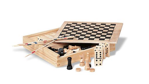 Vier Spiele in einer Holzbox: Mikado, Domino, Schach und Dame