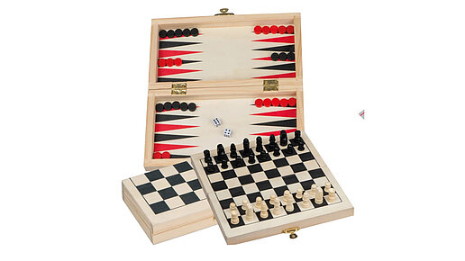 Backgammon, Schach und Dame - für vielseitigen Spielspaß in einer Holzbox.