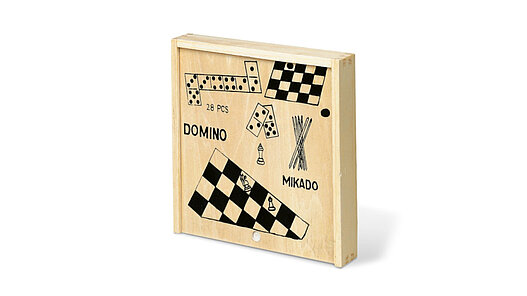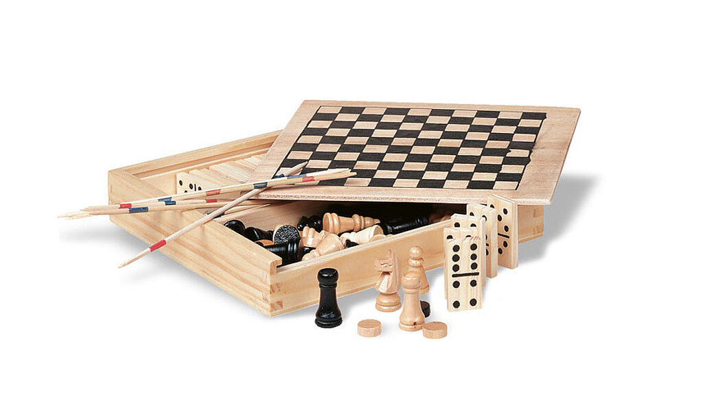 Vier Spiele in einer Holzbox: Mikado, Domino, Schach und Dame