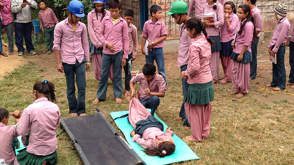 Über den kleinen Spielplatz für die Vorschulkinder mit Wippe, Schaukel und Rutsche ging es in den Raum der Vorschulklasse und dann weiter durch Räume, die gerade wieder instand gesetzt wurden Inzwischen hatten sich die Schüler auf dem Schulhof versammelt und warteten auf uns. Sie hatten in den letzten Monaten gelernt, wie sie sich im Katastrophenfall verhalten müssen und wollten es uns zeigen. Mit Tragen wurden „verletzte“ Schüler aus dem Gebäude gebracht und vor unseren Augen „verarztet“. Alles ging sehr diszipliniert zu.